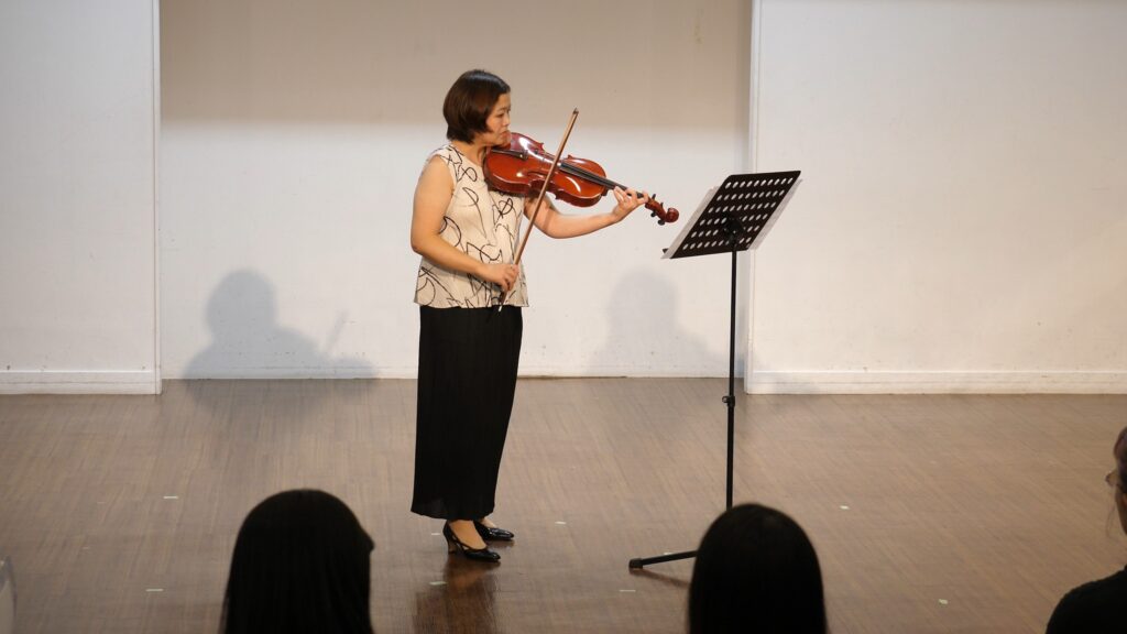 手に汗を握るヘイニネン作品の次には、第一部でも素晴らしいレクチャーを聴かせてくれた作曲家、オッリ・モイラネンのヴィオラ独奏作品《Laskostuu》です。「Laskostuu」とは、「何かが折り重なってゆく」その動きを示した単語であり、その音楽は静かに重なりゆく現象のダンスとも言える、一種の優雅さを湛えた作品でした。モイラネン本人が「優しく揺れるメロディーがハーモニーへと折りたたまれてゆく」様子を描いた「ダンスである」と語っていますが、福田さんの演奏は、まさにその言葉を体現するかのような透明感のある音楽を届けてくれました。それは一方で、ヘイニネンが前衛を極めた時代-20世紀末から現代に至る中で表面化した、「肩の力の抜けた美しさ」を表しているかのようでもありました。