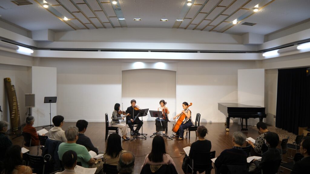 後半の幕開けを飾るのは、本年90歳を迎えながら今なお旺盛な作曲活動を展開するフィンランド音楽界の長老、アウリス・サッリネンの弦楽四重奏曲第3番です。演奏は前半を彩ってくれた二人のヴァイオリニスト、中澤沙央里さんと迫田圭さん、そしてヴィオラには福田道子さん、チェロには北嶋愛季さん。《ペルトニエミ・ヒントリーキの葬送行進曲の諸相》という長い副題がついた本作は、1969年に書かれた作品ですが、その「聴きやすさ」は現代音楽がただ複雑怪奇なだけの世界ではないことを教えてくれるかのようです。同名の流行歌から採られた主題(いかにも北欧的・フィンランド的な!)による、概して変奏曲の形式をとる本作ですが、そこにはのどかさや寂しさ、妖しさや可笑しみが常に孕んでいるかのよう。四者の演奏はそうした情景を浮かび上がらせてくれる、個性を捉えた素晴らしい演奏でした。